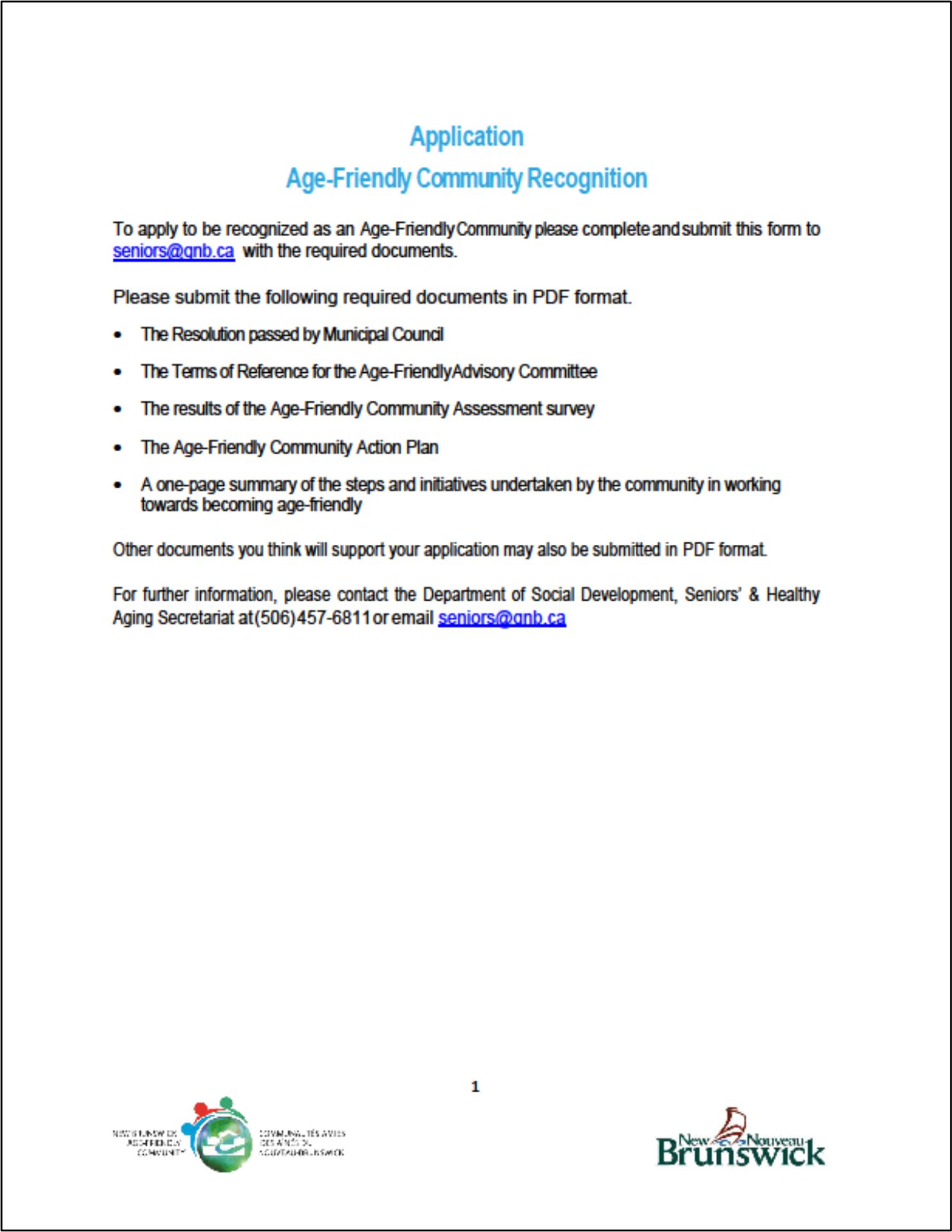 Step 5: Submit their application to Seniors@gnb.ca to become recognized as a NB Age Friendly Community.